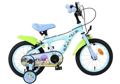 Voor jonge Bluey-fans die klaar zijn voor hun eigen fietsavonturen, is er de 14 inch Bluey kinderfiets van Volare! Deze vrolijke lichtblauwe fiets met neon groene spatborden springt meteen in het oog en is volledig in stijl van de populaire tv-heldin Bluey. Met kleurrijke prints op het frame én een stoer voorplaatje met Bluey’s gezicht is elke rit een feest vol herkenning en plezier.