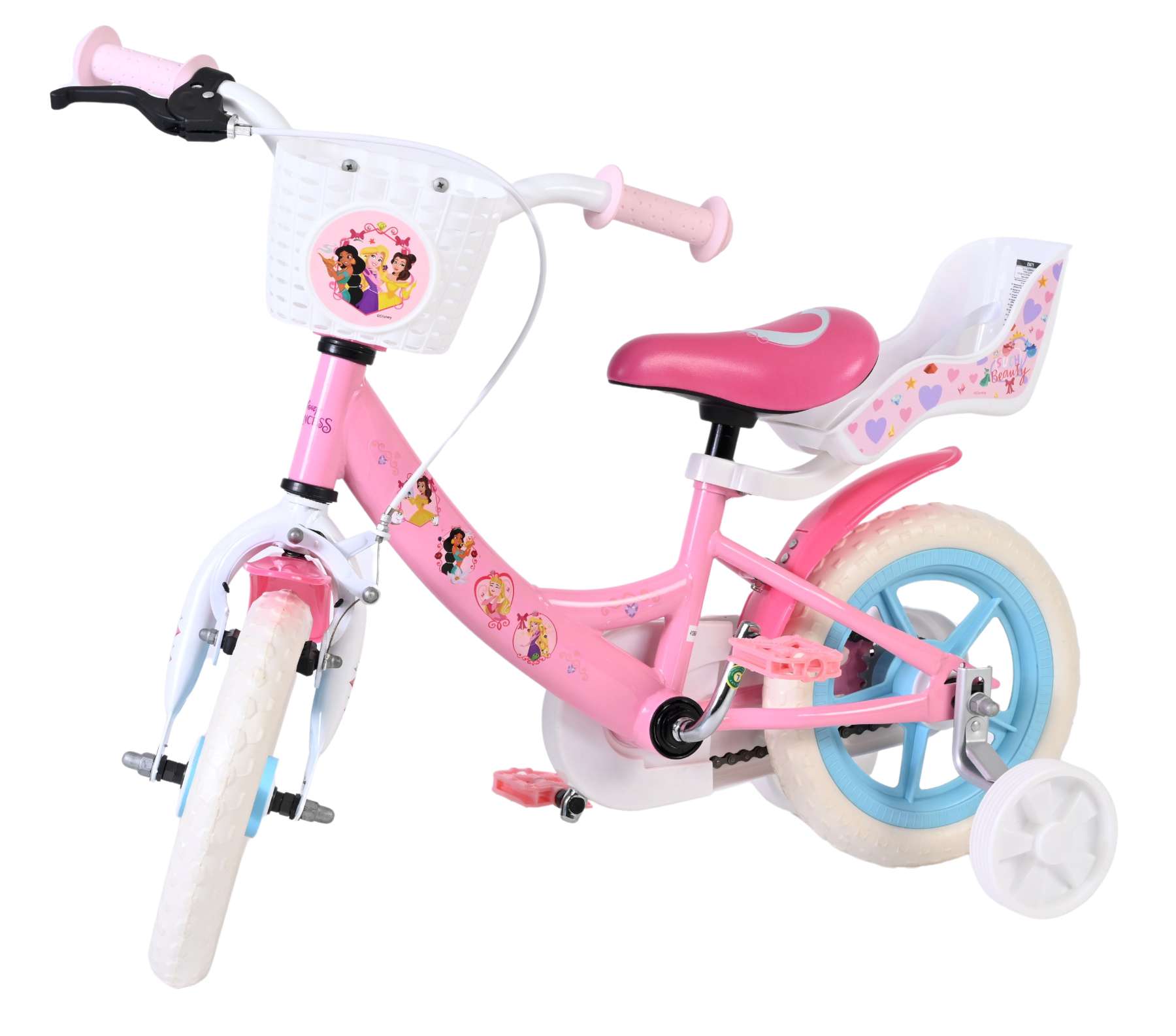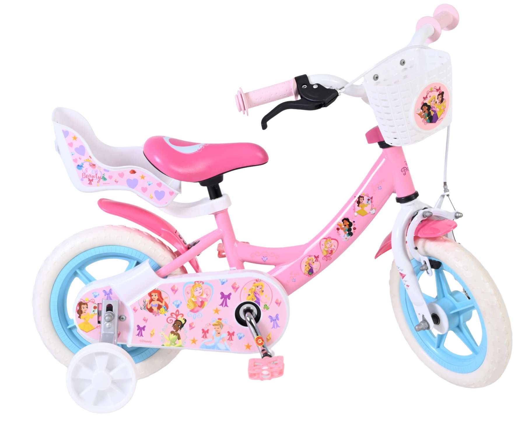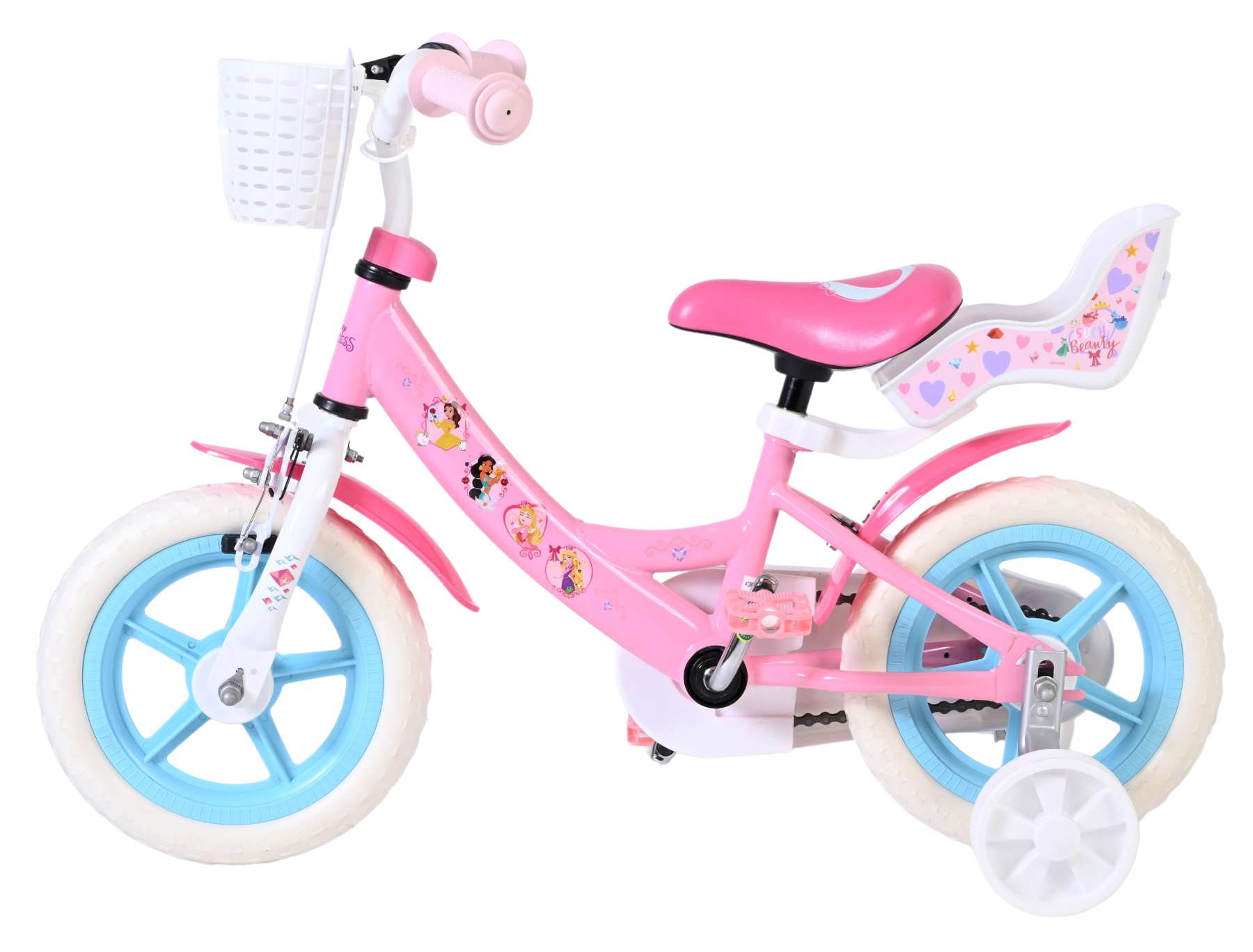 Voor extra stabiliteit tijdens het leren fietsen is de fiets voorzien van afneembare zijwielen. De fiets is uitgerust met een mandje aan de voorkant voor kleine spulletjes en een poppenzitje aan de achterzijde, zodat favoriete poppen of knuffels altijd mee op pad kunnen.