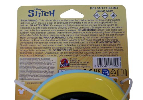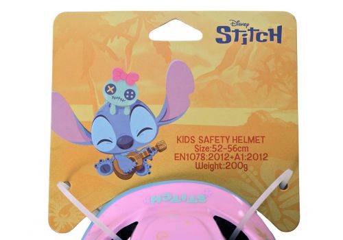 Volare Kinderfietsen beschikt over een grote collectie licentie helmen. Een daarvan is deze prachtige Disney Stitch fietshelm. De mooie roze kleur en de Stitch decoraties geven de helm een perfecte uitstraling. Met de draaiknop is de hoofdomtrek van de helm verstelbaar van 52 tot 56 cm. Daarbij is de onderkant van de helm ook bedekt. De helm weegt slechts 200 gram. Dat maakt hem extra licht en dus makkelijk te dragen. De helm is naar de strengste eisen van het TÜV/GS goedgekeurd.