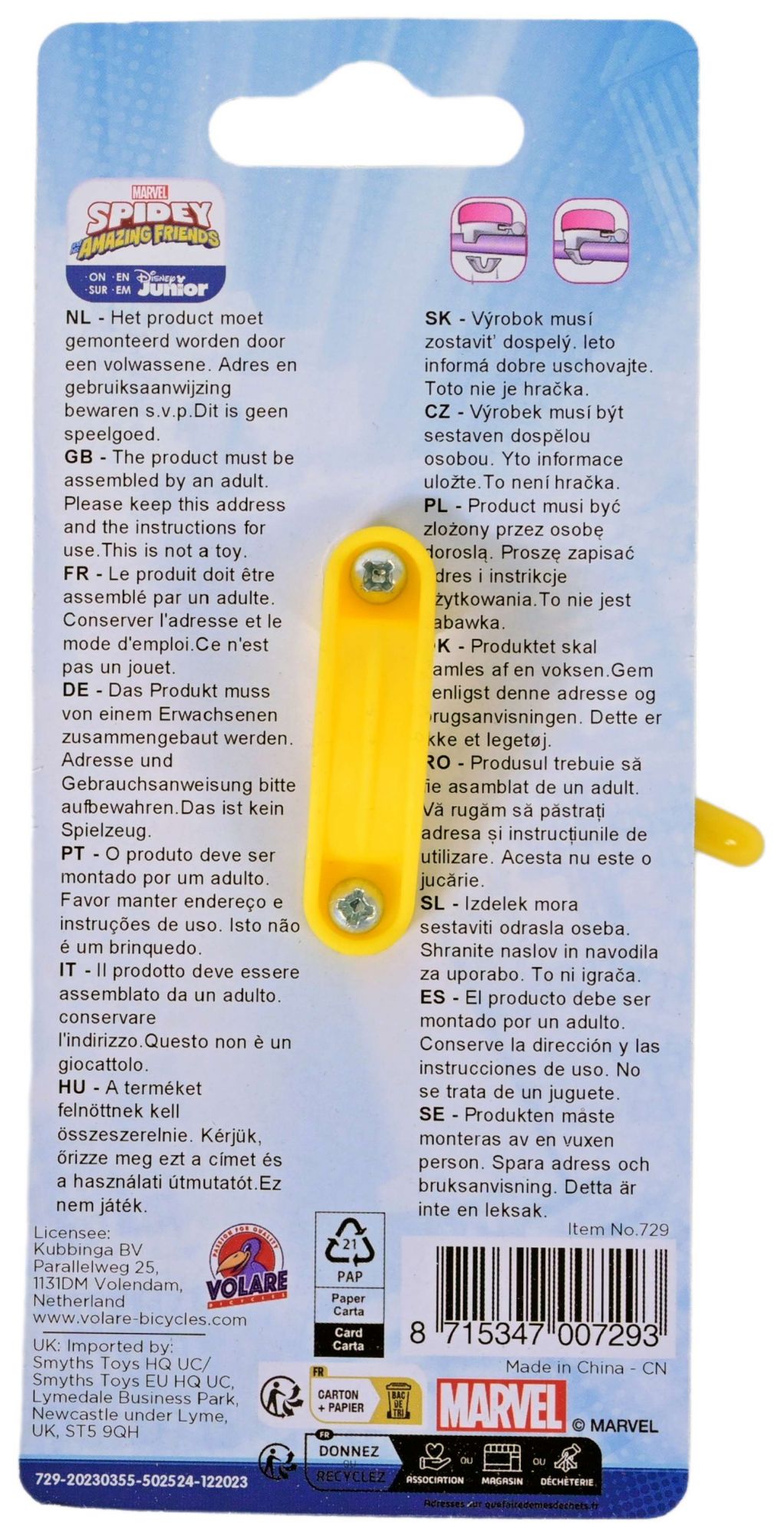 Deze coole Marvel Spidey fietsbel is makkelijk te bevestigen aan de fiets van iedere Spidey en his Amazing Friends-fan! Laat je fietsbel klinken, zodat iedereen weet dat je de hoek om komt. Ring-ring!