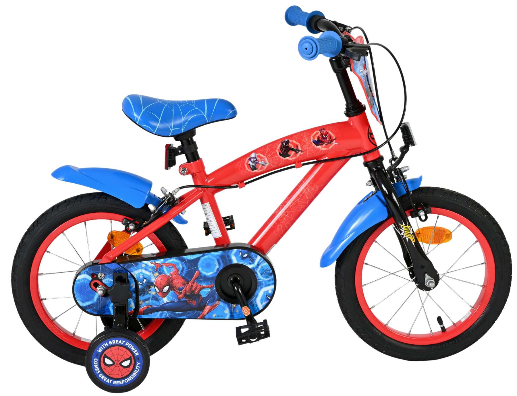 Veiligheid staat voorop! Daarom heeft deze gave fiets twee handremmen (geen terugtraprem) en een gesloten kettingkast. Daarnaast heeft de fiets afneembare zijwieltjes om snel te leren fietsen en reflectoren in de trappers. Ook aan het comfort is gedacht. De mooie rode Spiderman fiets met blauwe accenten heeft een aangenaam zacht zadel en een extra stevig frame dat wel tegen een stootje kan. Om zo lang mogelijk van de fiets te kunnen genieten zijn het zadel en stuur in hoogte verstelbaar. Kortom: een topkwaliteit fiets waar uw kind nog jaren van kan genieten!
