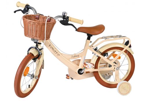 Ook aan praktisch gebruik is gedacht. Het mandje aan de voorkant is ideaal voor het meenemen van speelgoed of andere spulletjes, terwijl de stevige achterdrager zorgt voor extra gebruiksgemak. Met zijn frisse creme kleur en complete uitrusting is de Volare Ashley 14 inch kinderfiets een fijne en betrouwbare keuze voor jonge fietsers.
