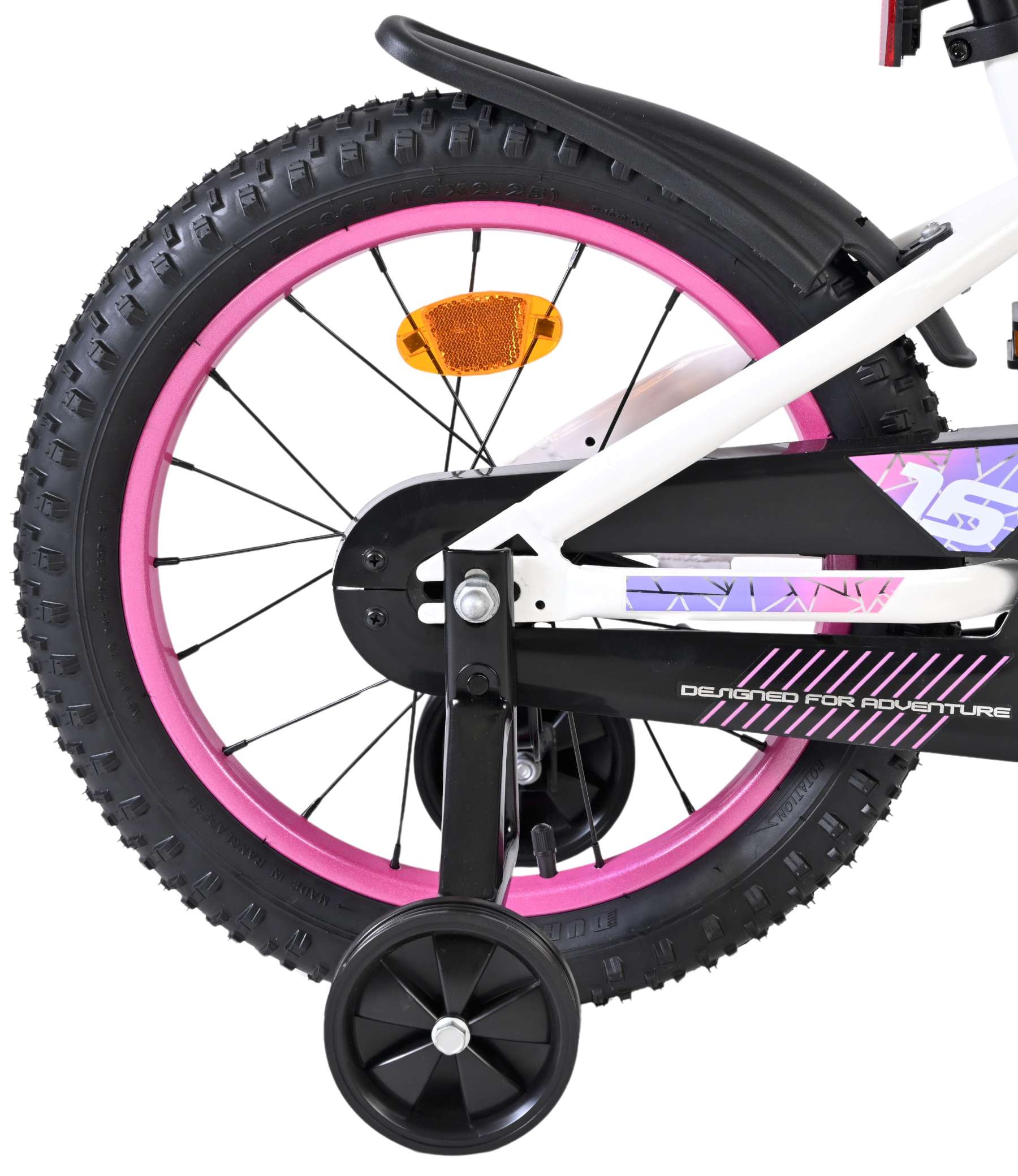 De fiets is uitgerust met een terugtraprem en een handrem, zodat er altijd veilig en gecontroleerd geremd kan worden. De gesloten kettingkast beschermt kleine vingertjes en houdt de ketting schoon. Dankzij de reflectoren in de wielen, voor en achter, is je kind goed zichtbaar onderweg.