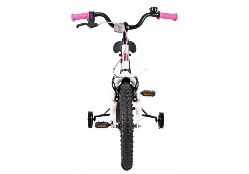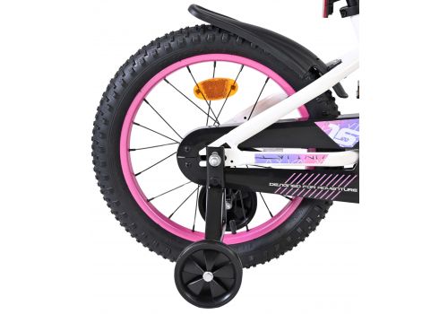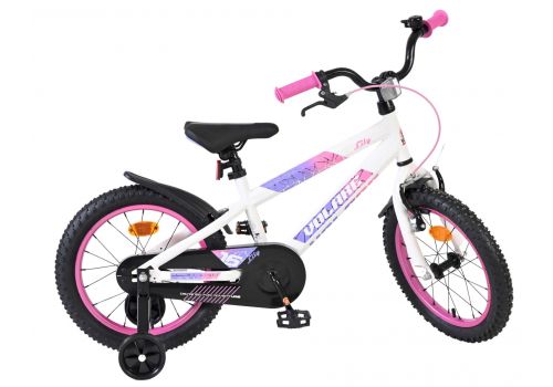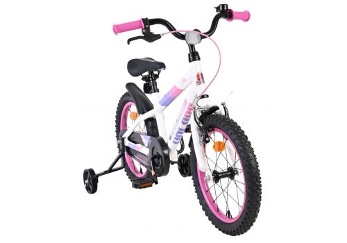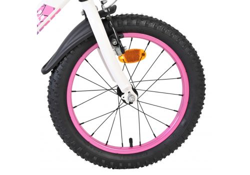 De Volare Lily 16 inch kinderfiets is een prachtige fiets voor jonge meiden die graag in stijl fietsen. Met haar frisse witte kleur, paarse en roze accenten en opvallende roze velgen en handvaten is deze fiets een echte eyecatcher.