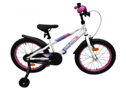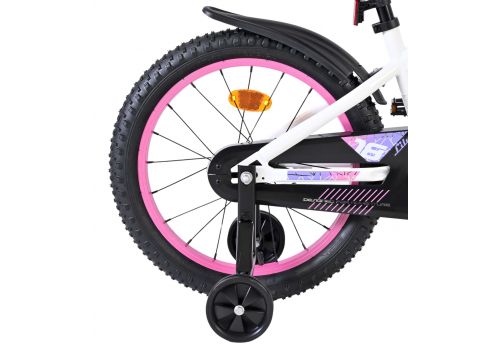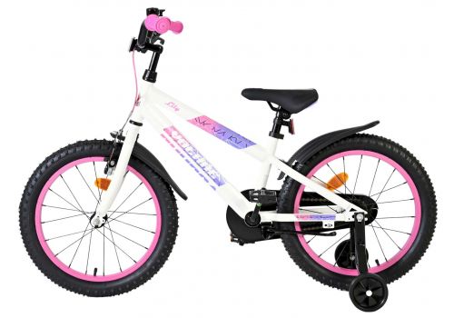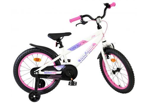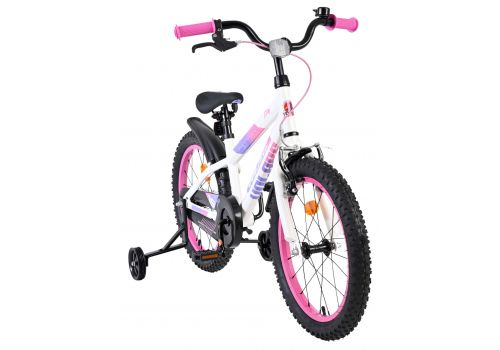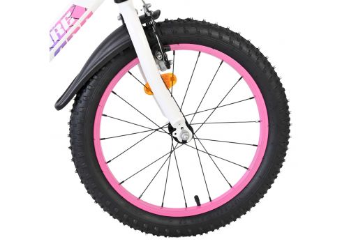 De Volare Lily 18 inch kinderfiets is een prachtige fiets voor jonge meiden die graag in stijl fietsen. Met haar frisse witte kleur, paarse en roze accenten en opvallende roze velgen en handvaten is deze fiets een echte eyecatcher.