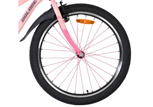 De fiets heeft verlichting aan de voor- en achterkant en reflectoren in de wielen, waardoor je kind goed zichtbaar is in het verkeer. Het sportieve karakter wordt extra benadrukt door de opvallende roze spaken, die de fiets een unieke uitstraling geven. Daarnaast beschikt de Volare Mystic over een slot en een bel, zodat je kind veilig en goed voorbereid op pad kan.