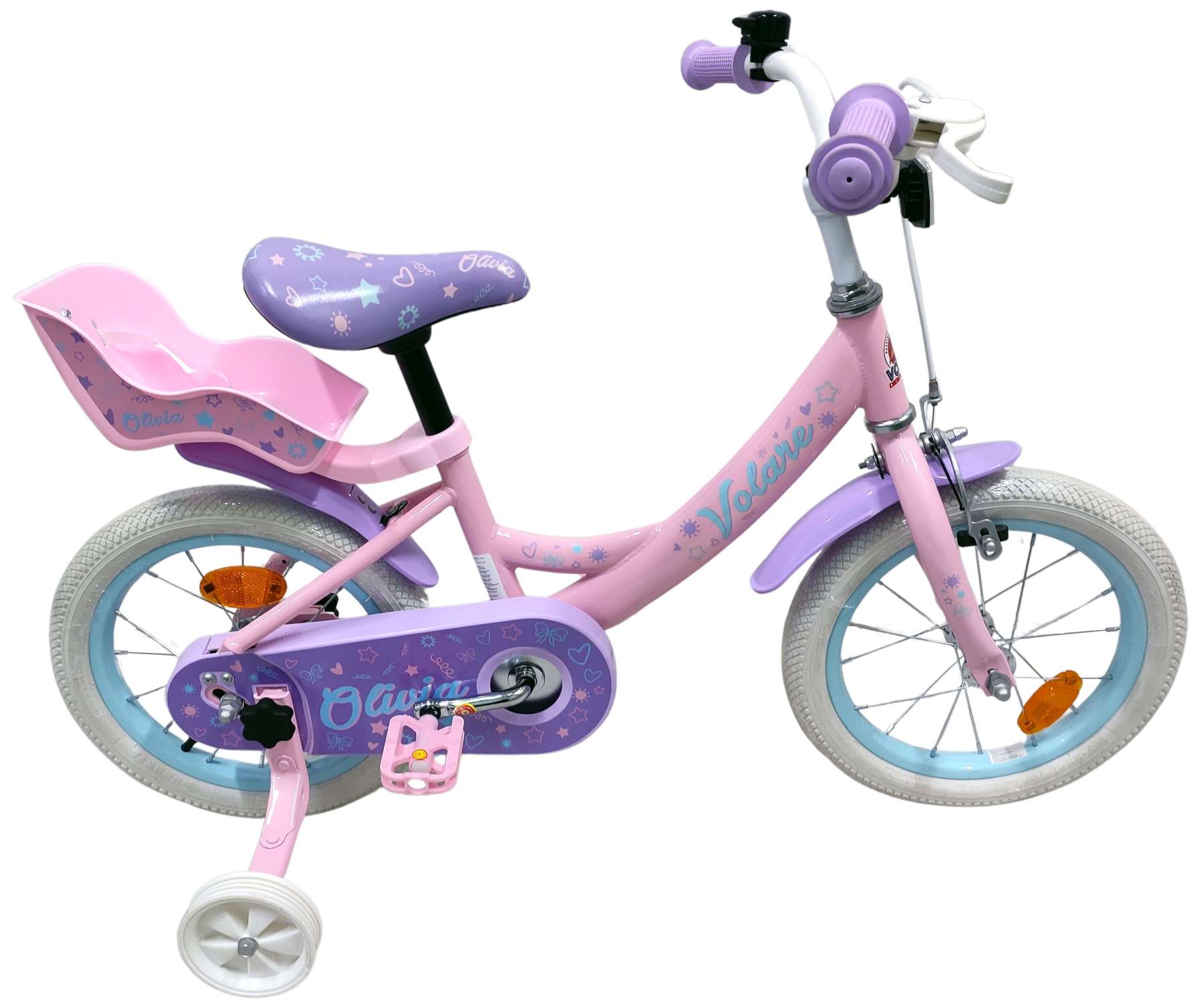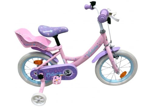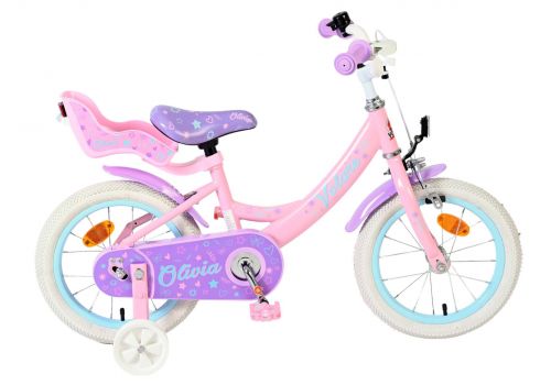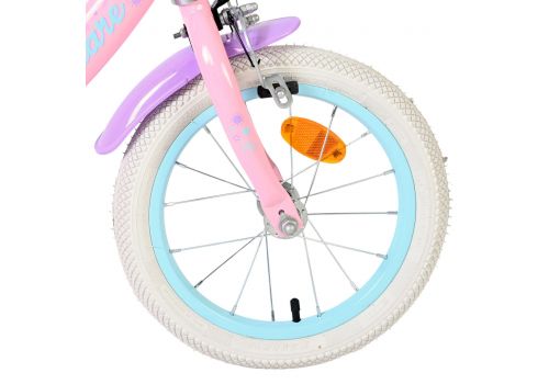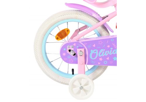 De Volare Olivia 14 inch kinderfiets is een schattige en stijlvolle fiets voor jonge meiden die vol trots willen leren fietsen. Met haar zachte roze kleur, paarse handvaten, zadel en spatborden is deze fiets een echte blikvanger.