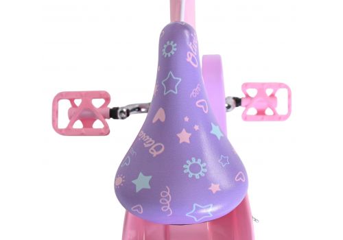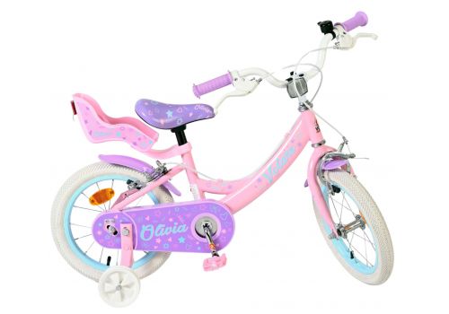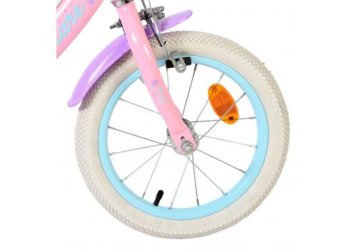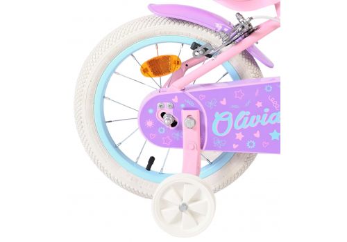 De Volare Olivia 14 inch kinderfiets is een schattige en stijlvolle fiets voor jonge meiden die vol trots willen leren fietsen. Met haar zachte roze kleur, paarse handvaten, zadel en spatborden is deze fiets een echte blikvanger.