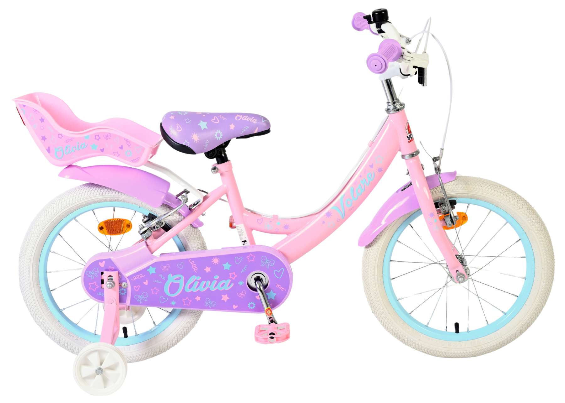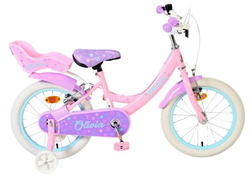 De Volare Olivia 16 inch kinderfiets is een schattige en stijlvolle fiets voor jonge meiden die vol trots willen fietsen. Met haar zachte roze kleur, paarse handvaten, zadel en spatborden is deze fiets een echte blikvanger.