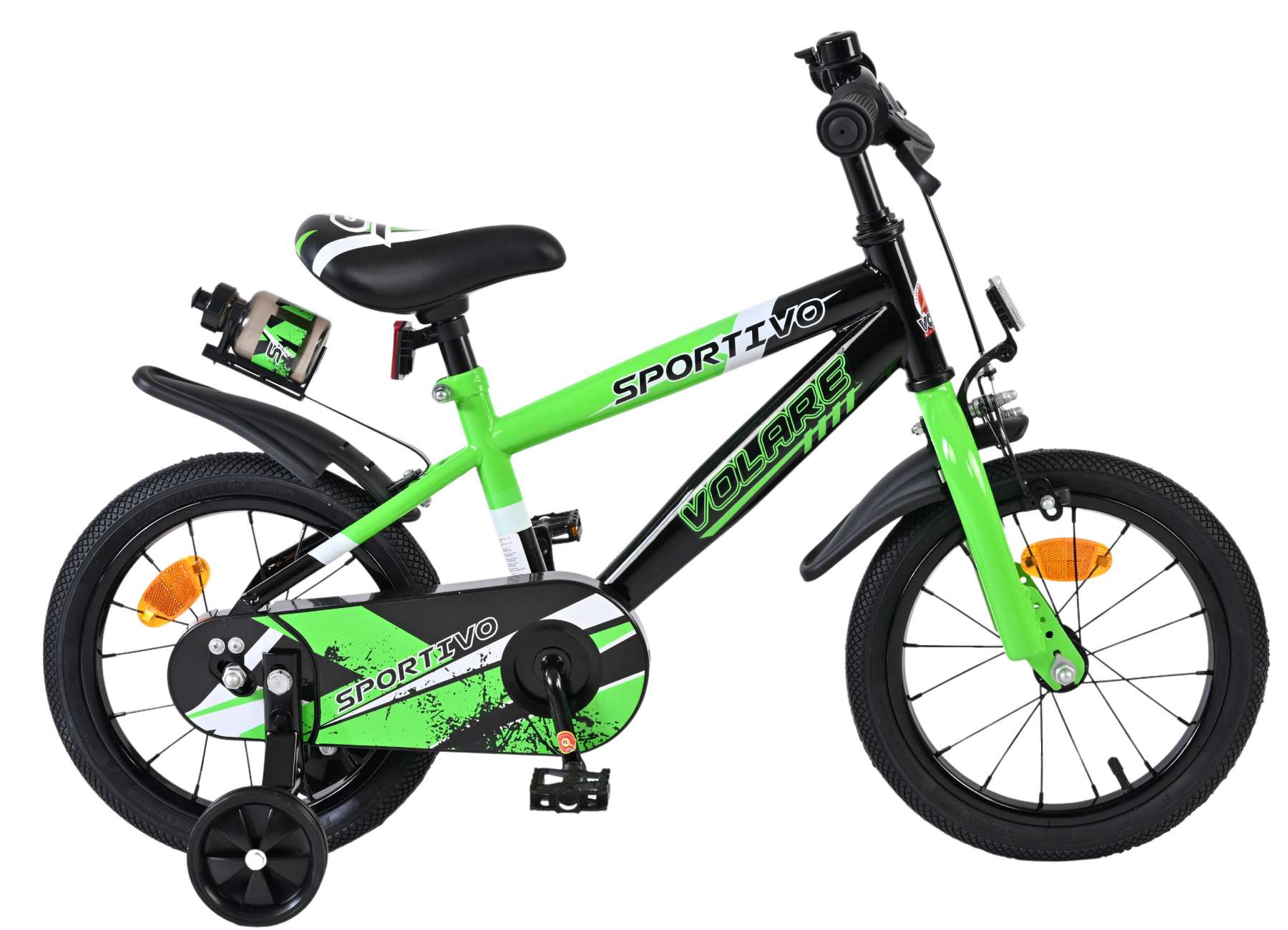 Veiligheid staat voorop! Daarom heeft deze gave fiets een gesloten kettingkast ter bescherming van de vingers. Deze fiets heeft een terugtraprem een handrem en afneembare zijwieltjes. Ook aan het comfort is gedacht. De mooie groene Volare fiets heeft een bidonhouder met bidon. Om zo lang mogelijk van de fiets te kunnen genieten zijn het zadel en stuur in hoogte verstelbaar.