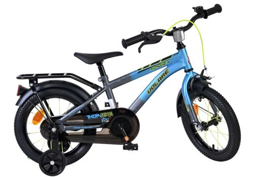 De Volare Thombike 14 inch in blauw met grijze accenten is een stoere kinderfiets met een sportieve uitstraling, perfect om veilig en met vertrouwen te leren fietsen. Dankzij de stevige afwerking en het frisse design is dit een echte favoriet voor jonge rijders.
